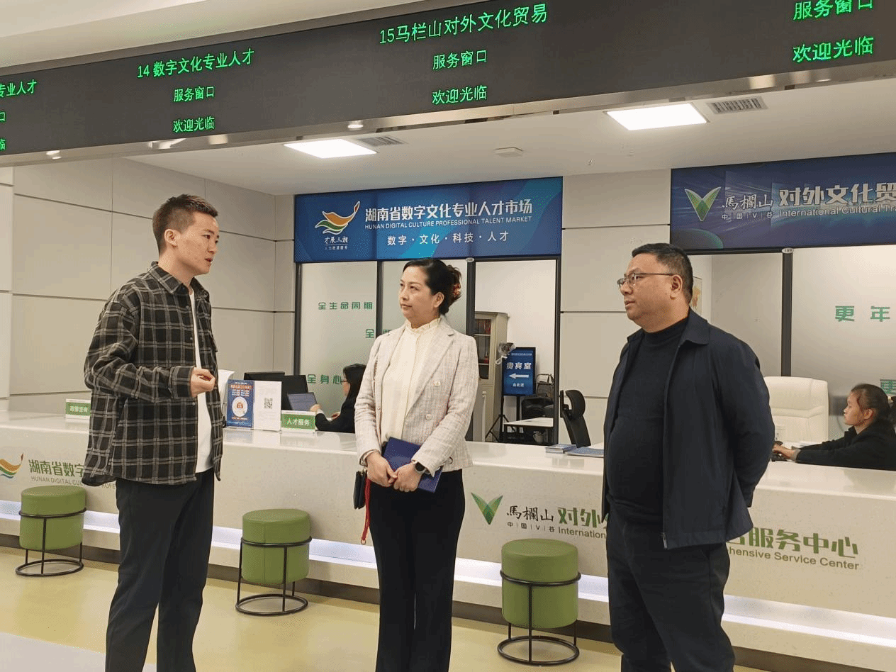 随后,在贾韶华的陪同下,赵奇钊、殷章馨一行走访了位于园区内的湖南省数字文化专业人才市场,实地参观了数字人才服务中心,并与市场主任何泽就人才培训、招聘服务、创业孵化等一站式服务的议题进行了探讨。