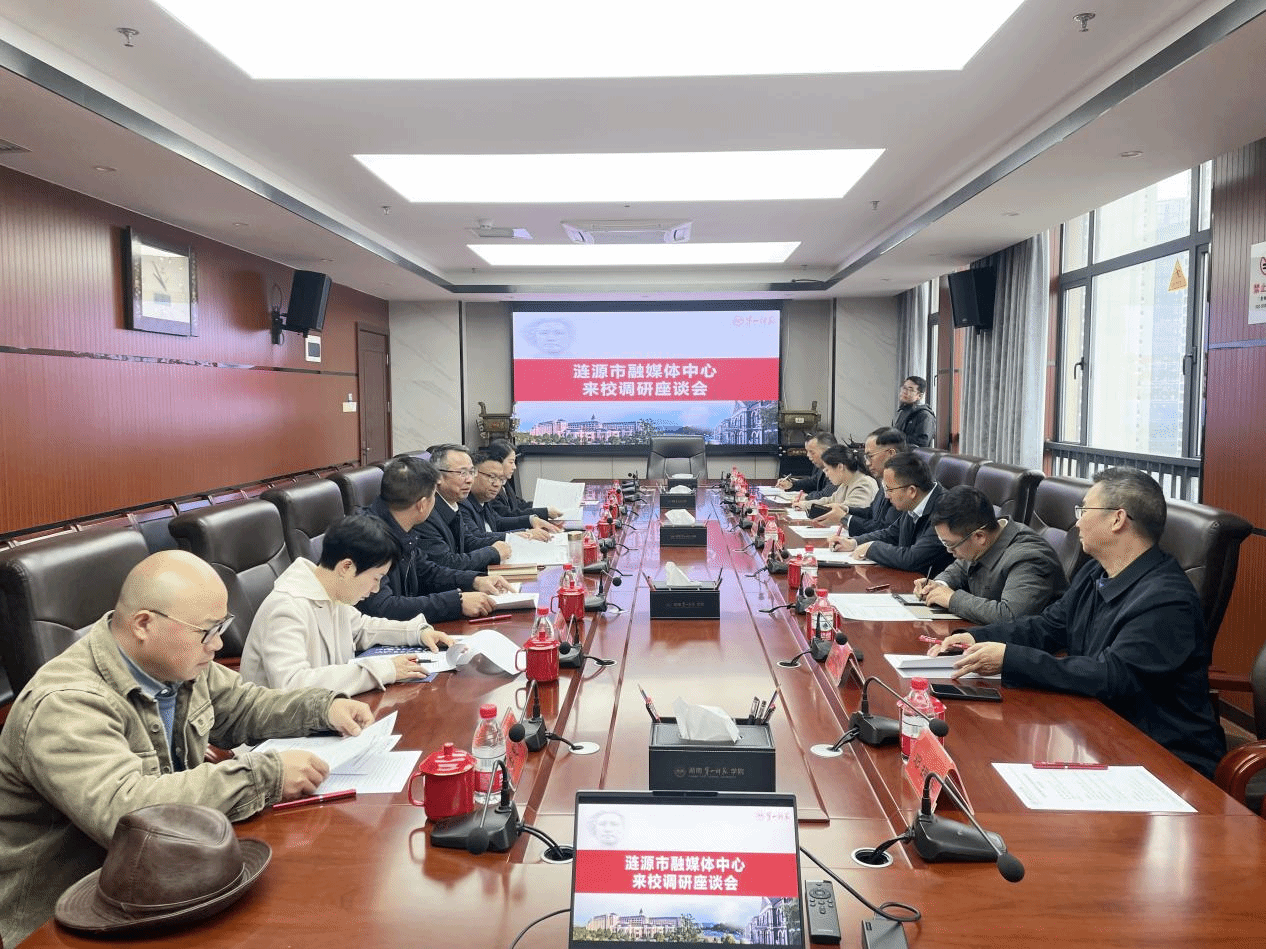 12月5日上午,涟源市委宣传部部长陈善干带队来校调研交流。校党委委员、副校长彭晓辉热情接待调研组一行。双方在百熙楼713会议室举行校地合作调研座谈会。会议由产教融合与校地企合作处负责人主持。美术与设计学院、商学院相关领导及教师代表参加座谈。