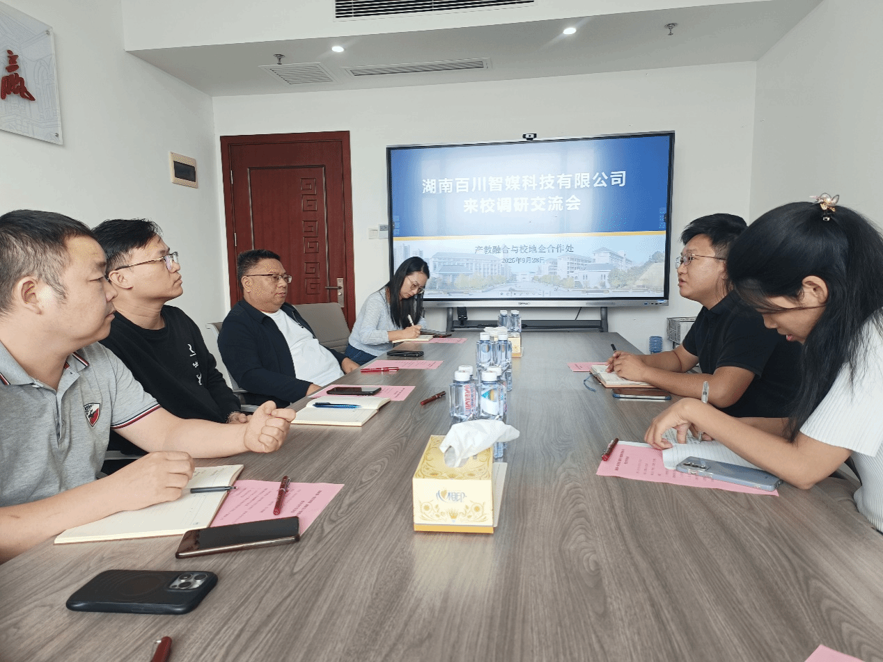 9月28日上午,湖南百川智媒科技有限公司来校调研交流,产教融合与校地企合作处处长赵奇钊,计算机学院、商学院、美术与设计学院、外国语学院相关负责人参加校企合作座谈会。