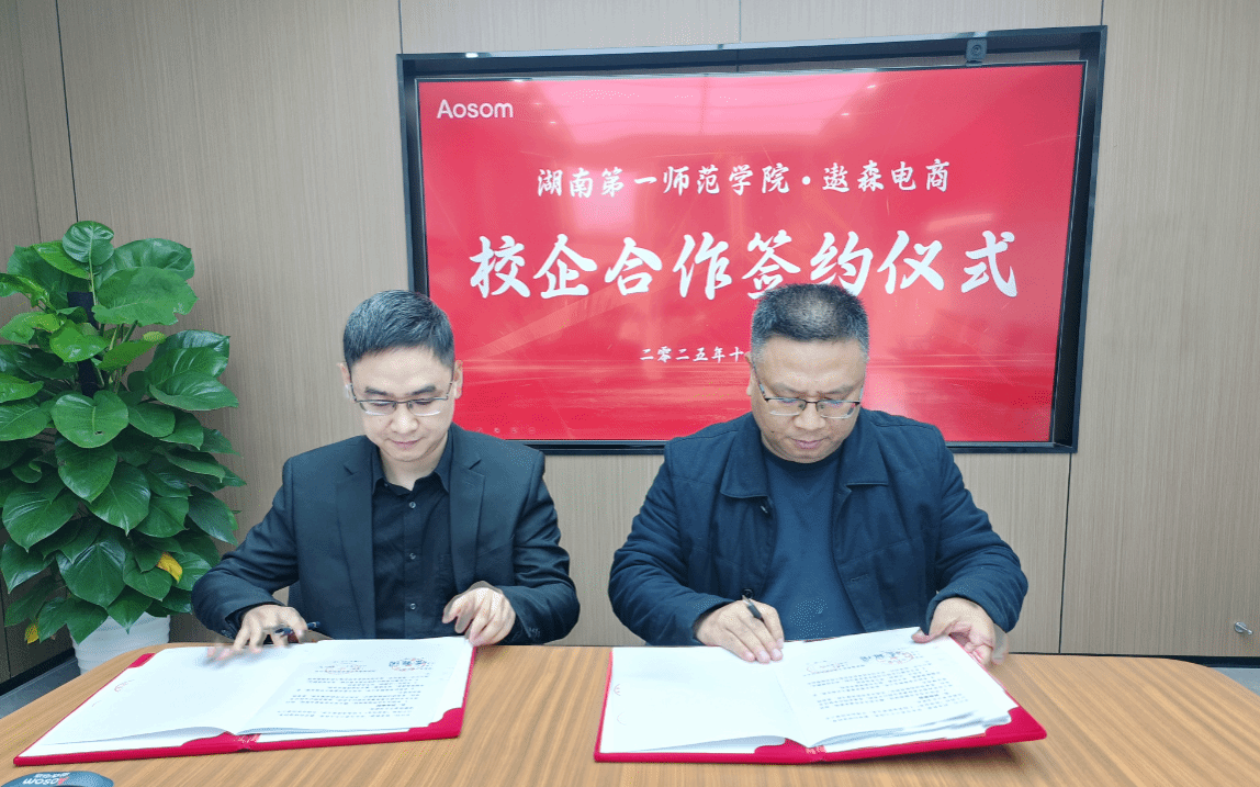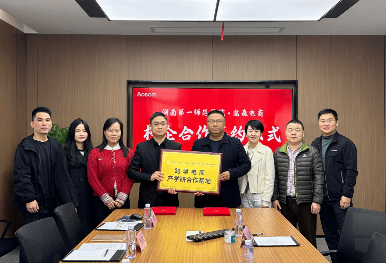 为落实学校与企业产学研一体化平台建设,深化校企合作、产学研融合的协同育人模式,11月12日上午,我校与湖南遨森电子商务有限责任公司正式签约并举行“跨境电商产学研合作基地”授牌仪式。学校产教融合与校地企合作处处长赵奇钊、美术与设计学院副院长蔡晓曦一行四人到该公司参加仪式。公司负责人严鹏、人力资源部负责人傅静等公司高管见证签约授牌。
